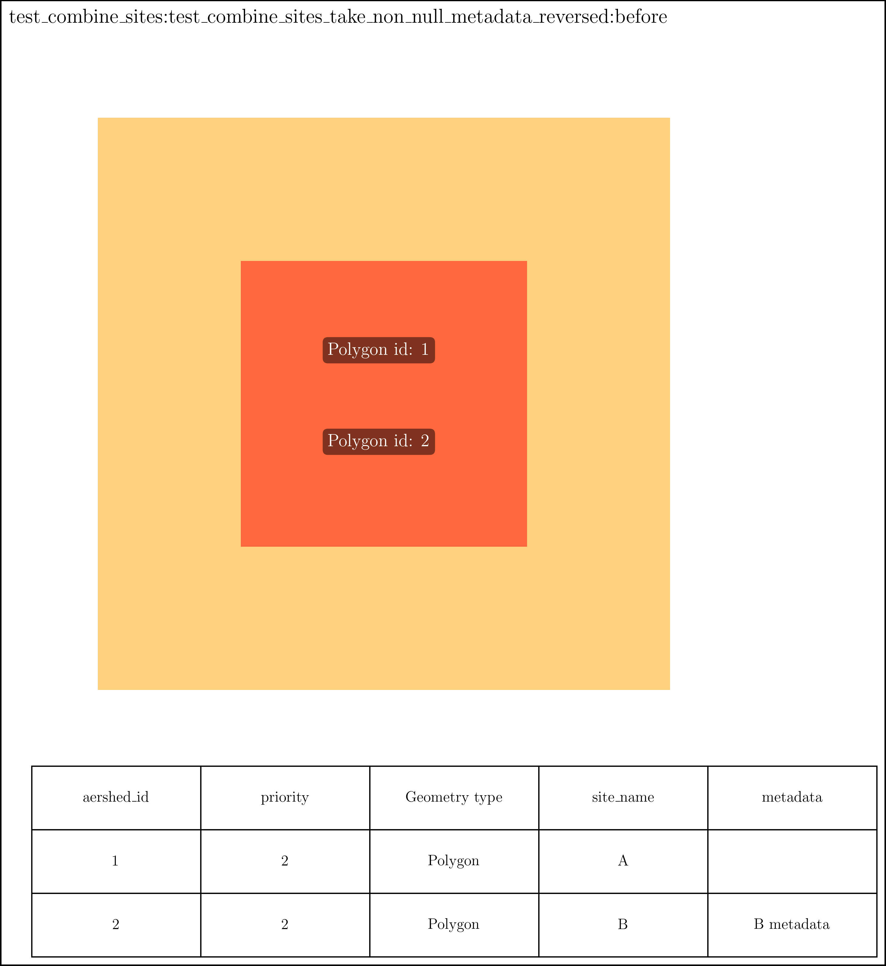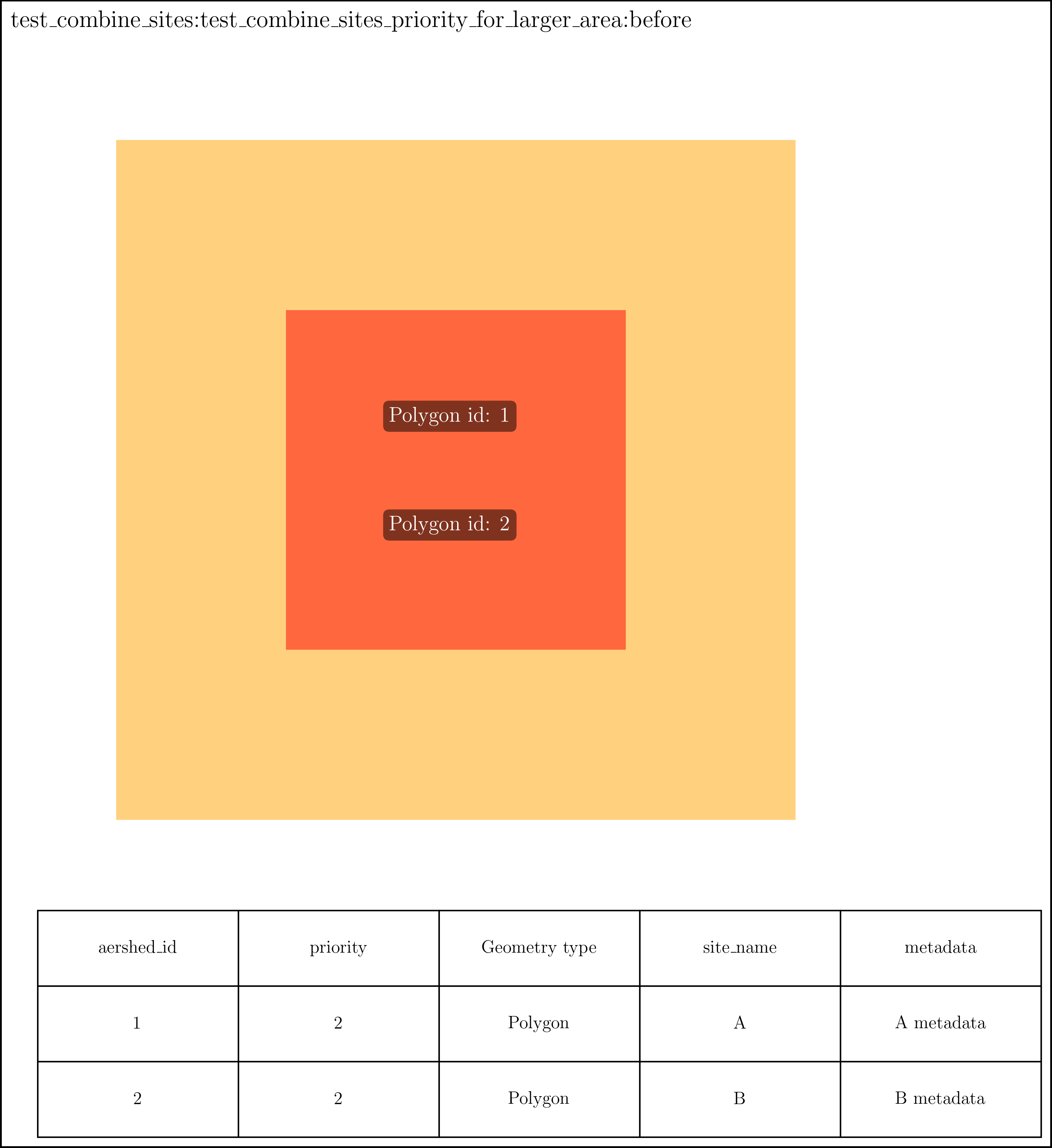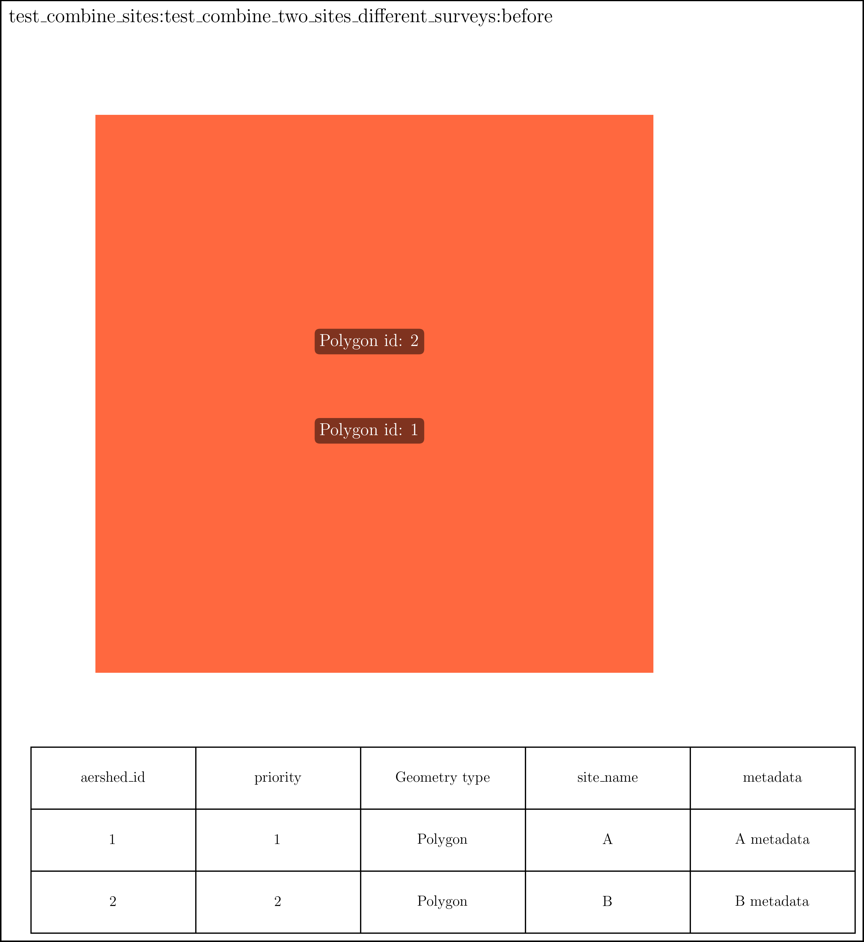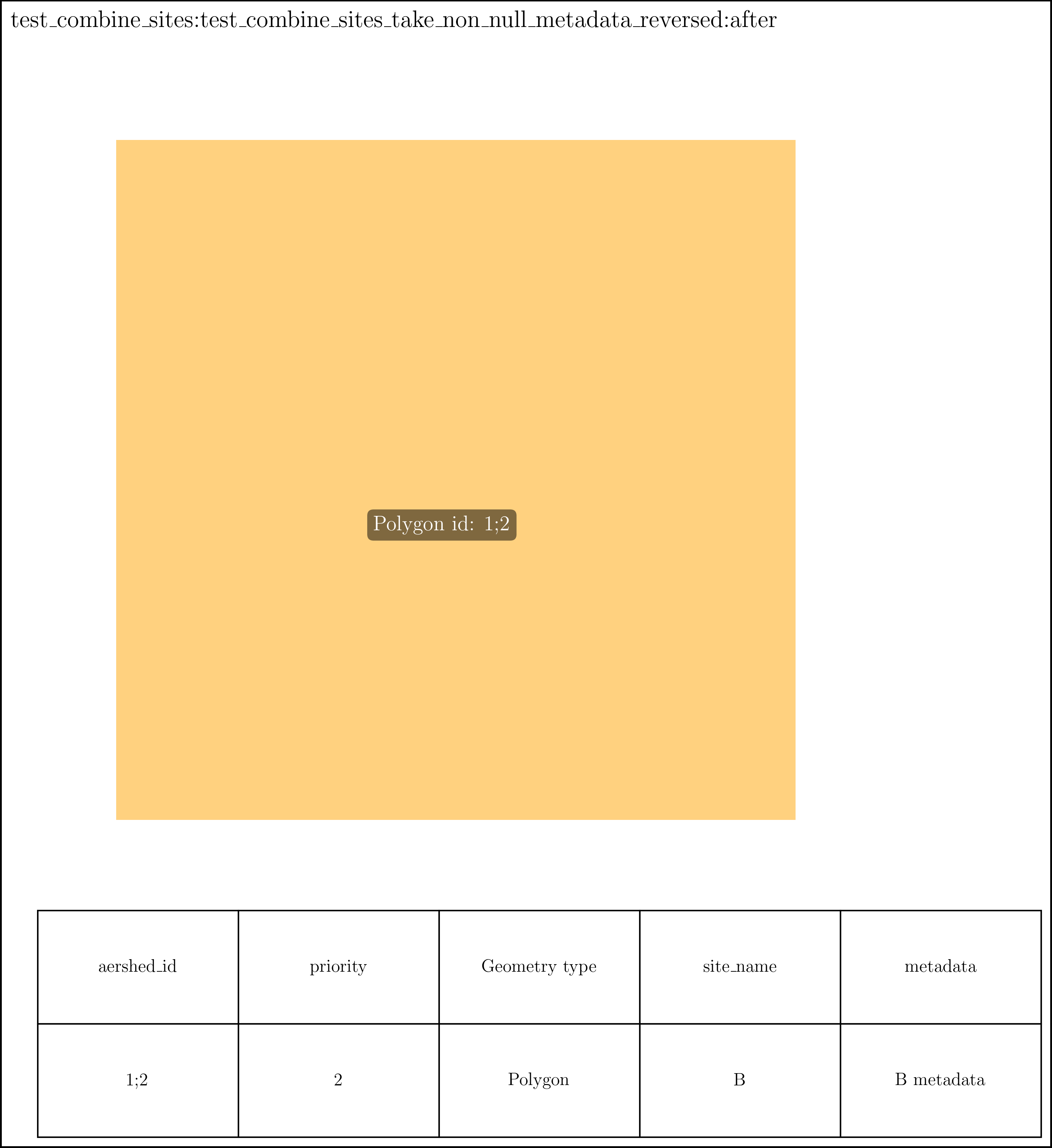 Combine two sites at the same location but with different polygons. The result should be a single site with the union of the two polygons and metadata from the higher priority site.