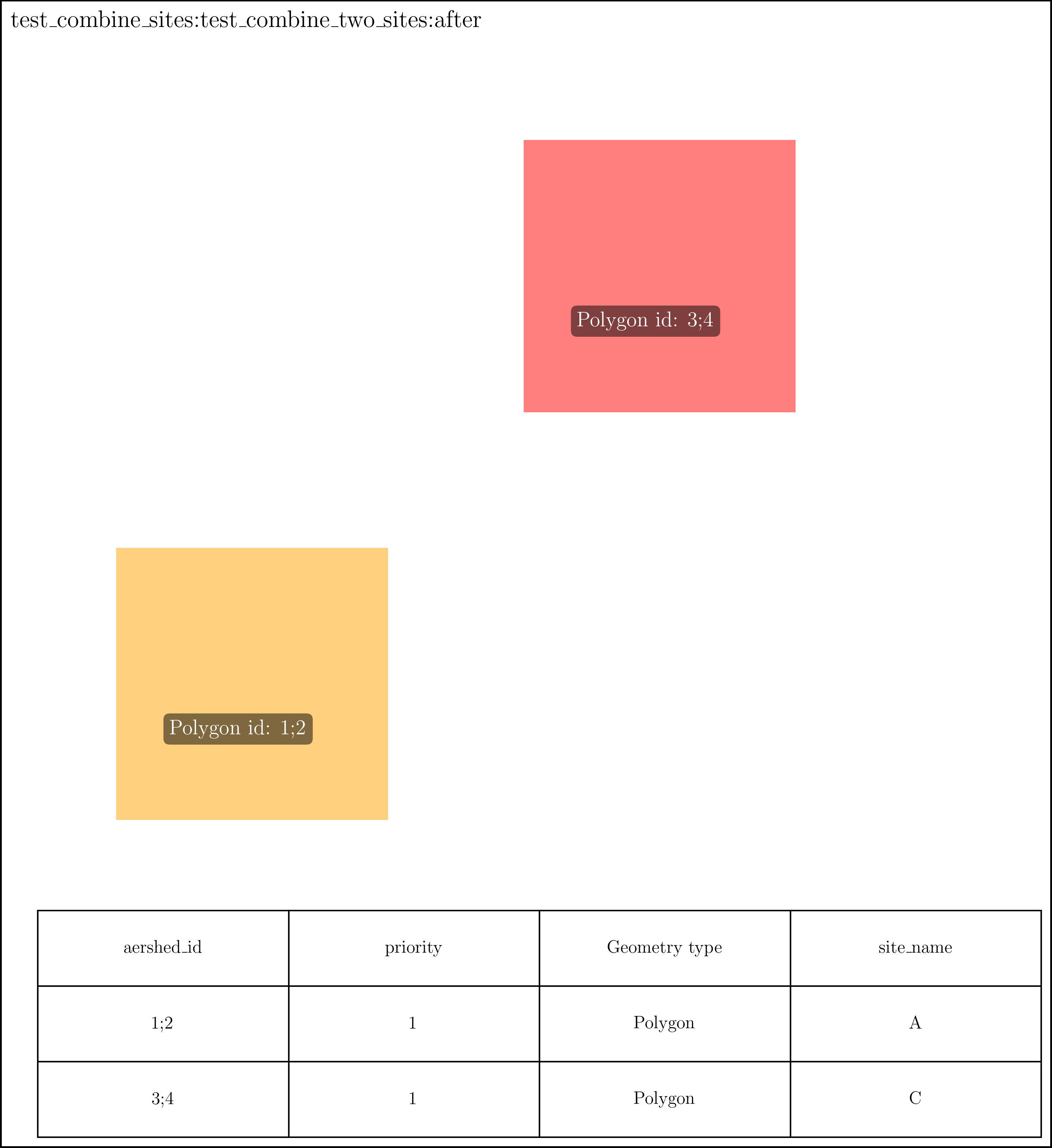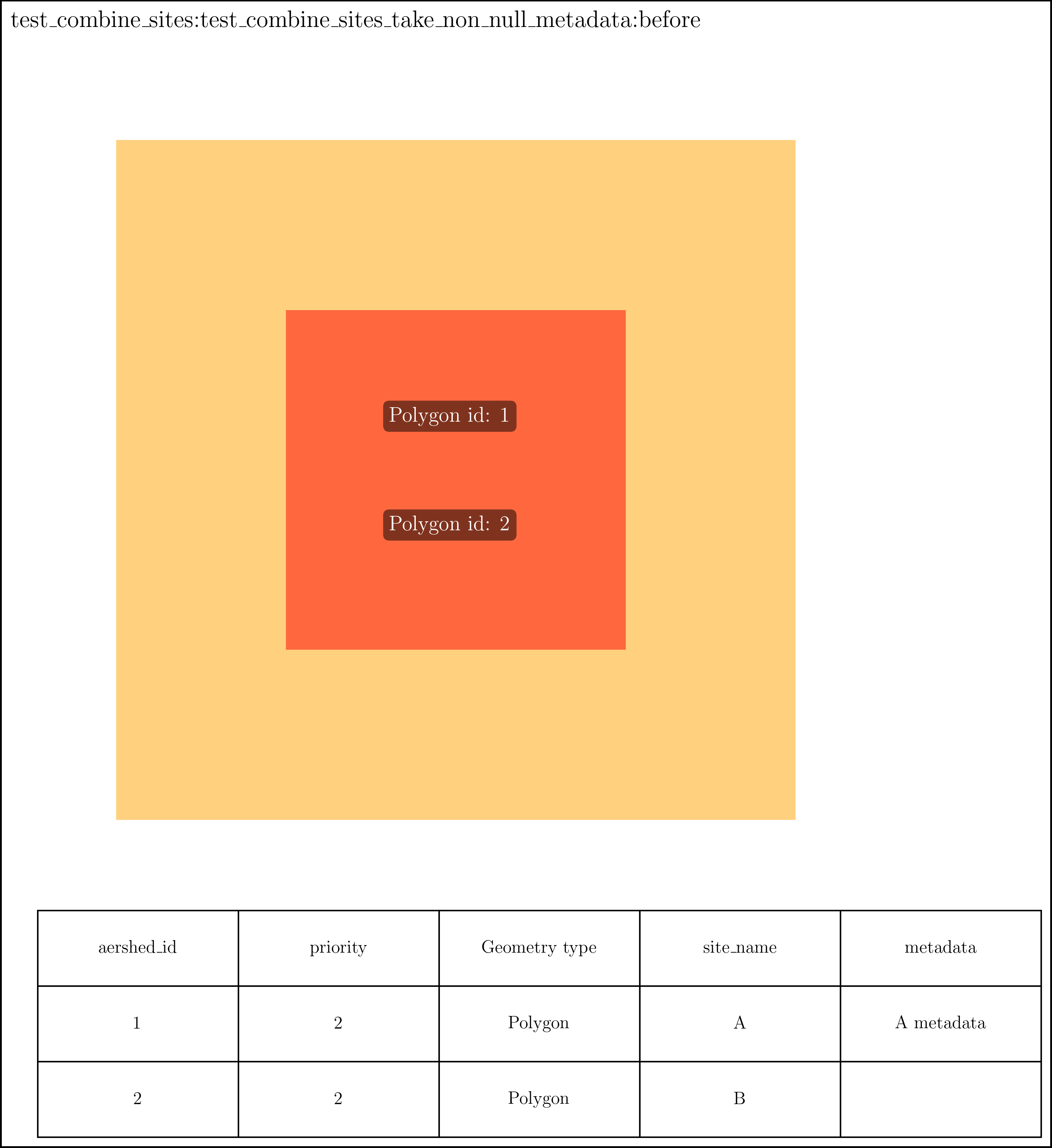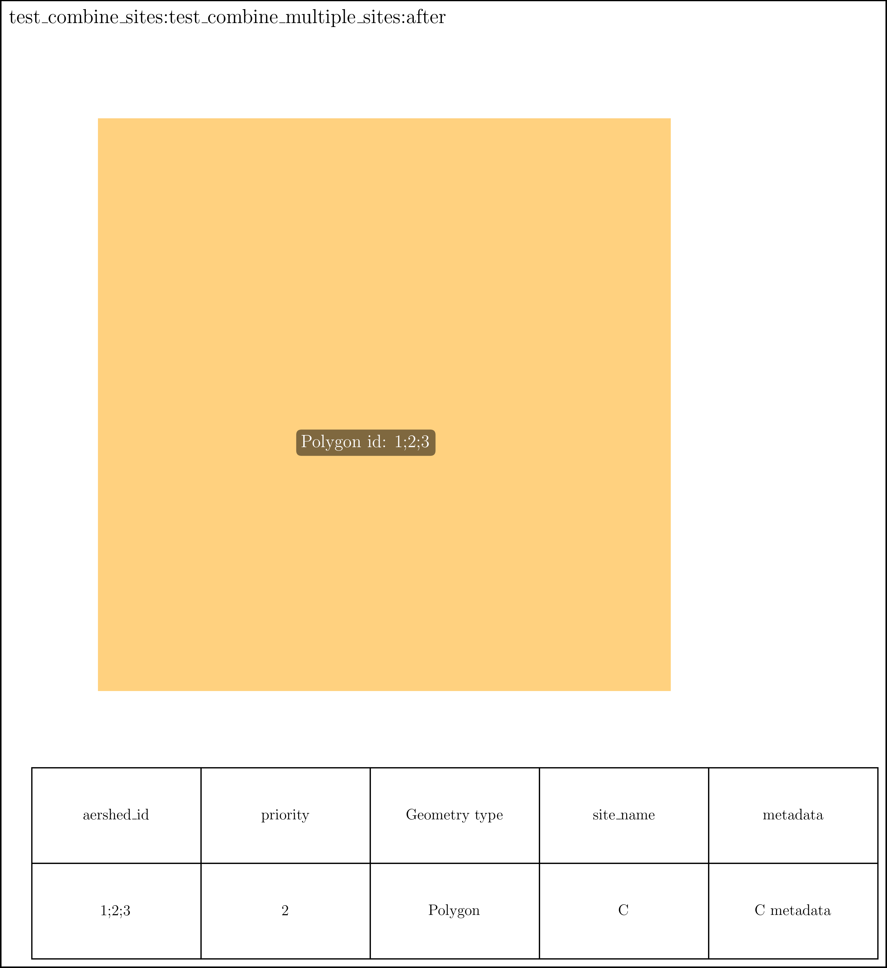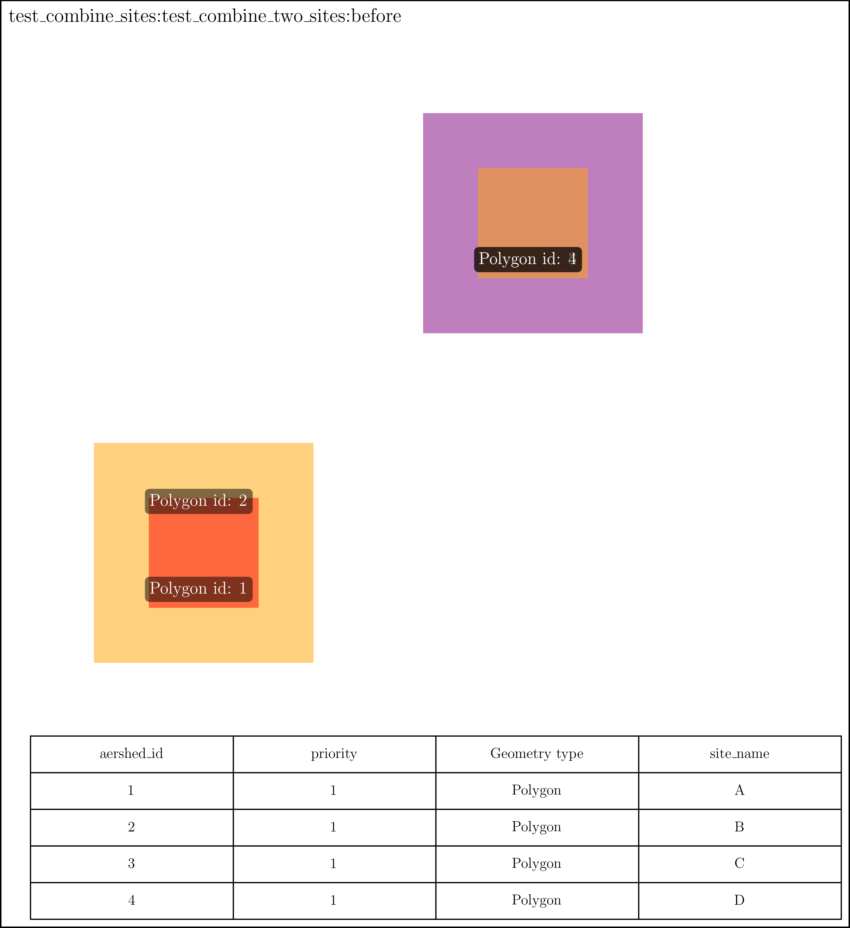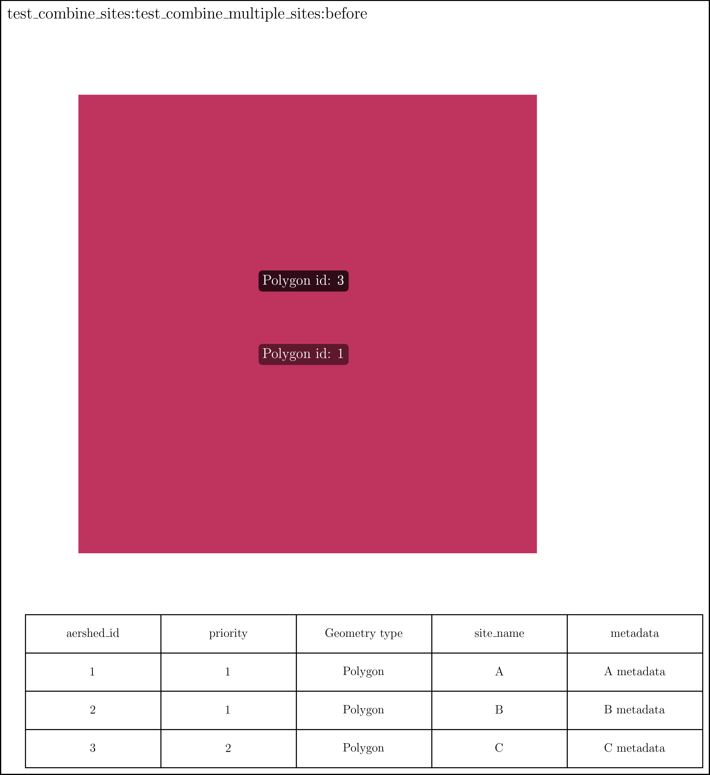 Combine two sites at the same location but with different polygons. The result should be a single site with the union of the two polygons and metadata from the higher priority site.