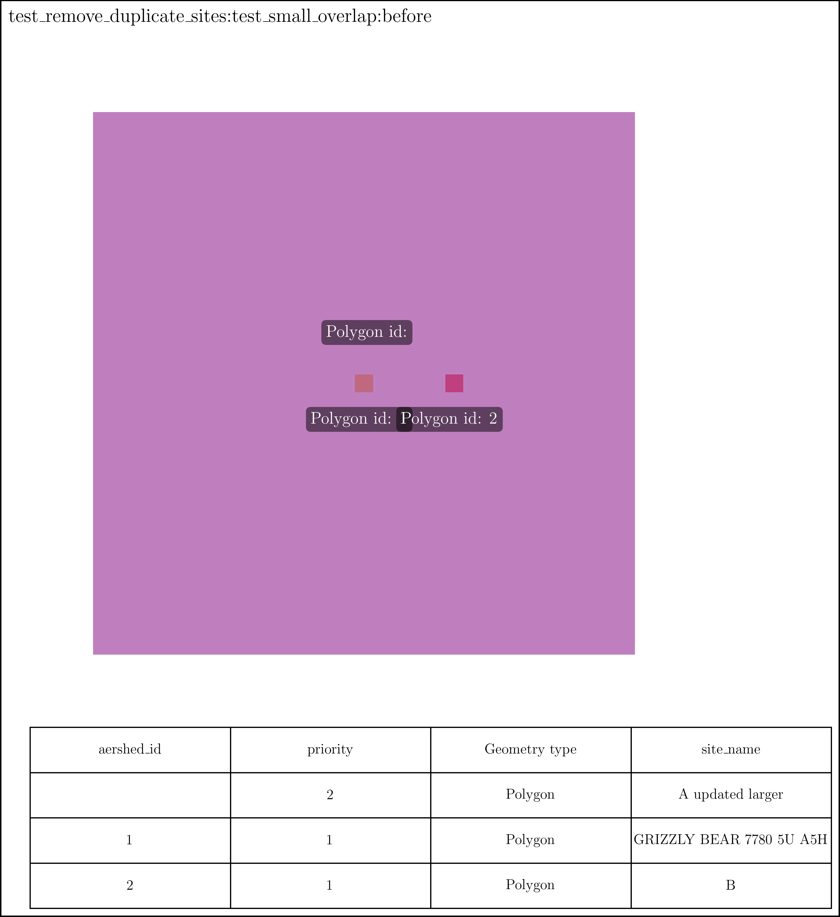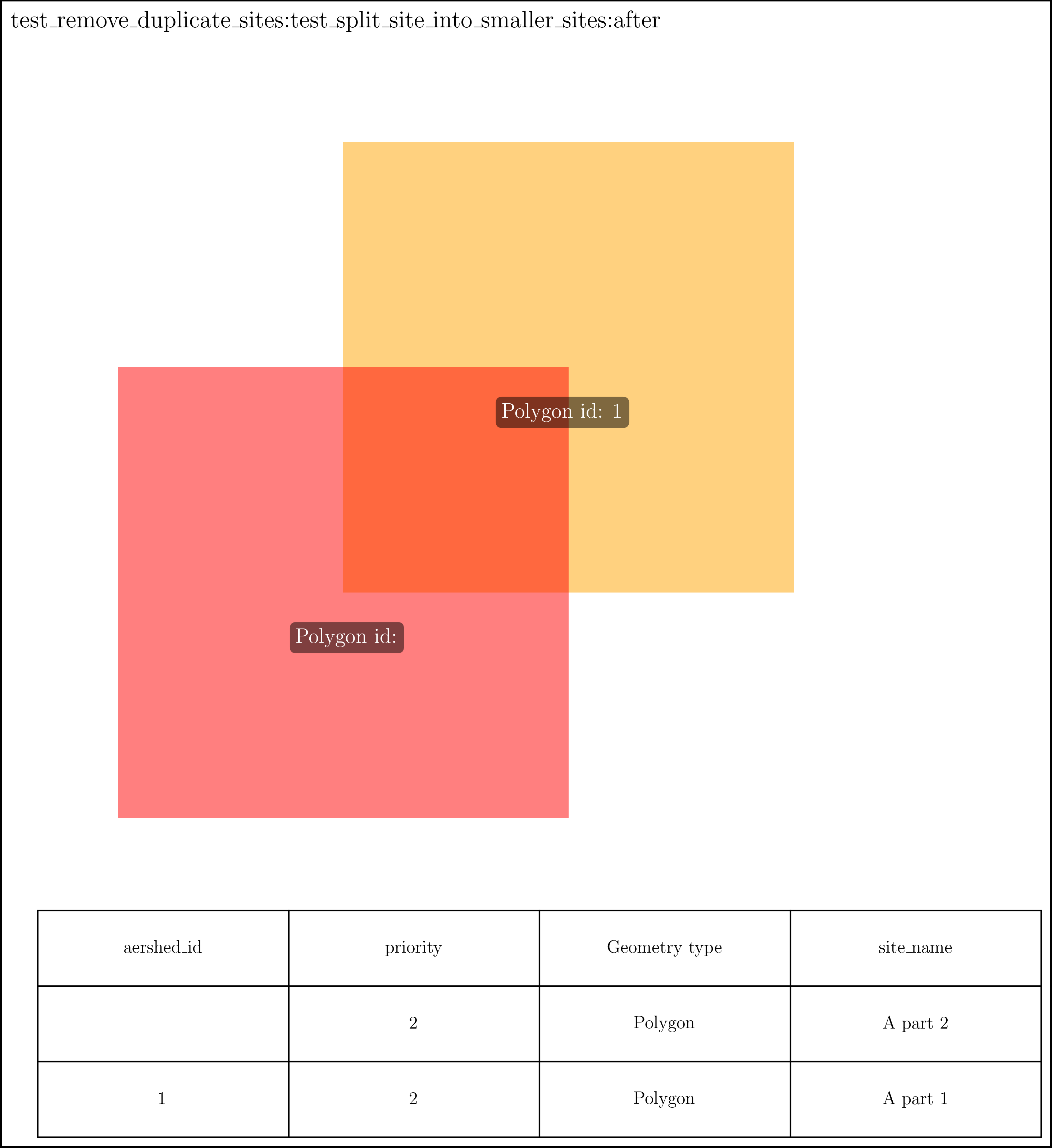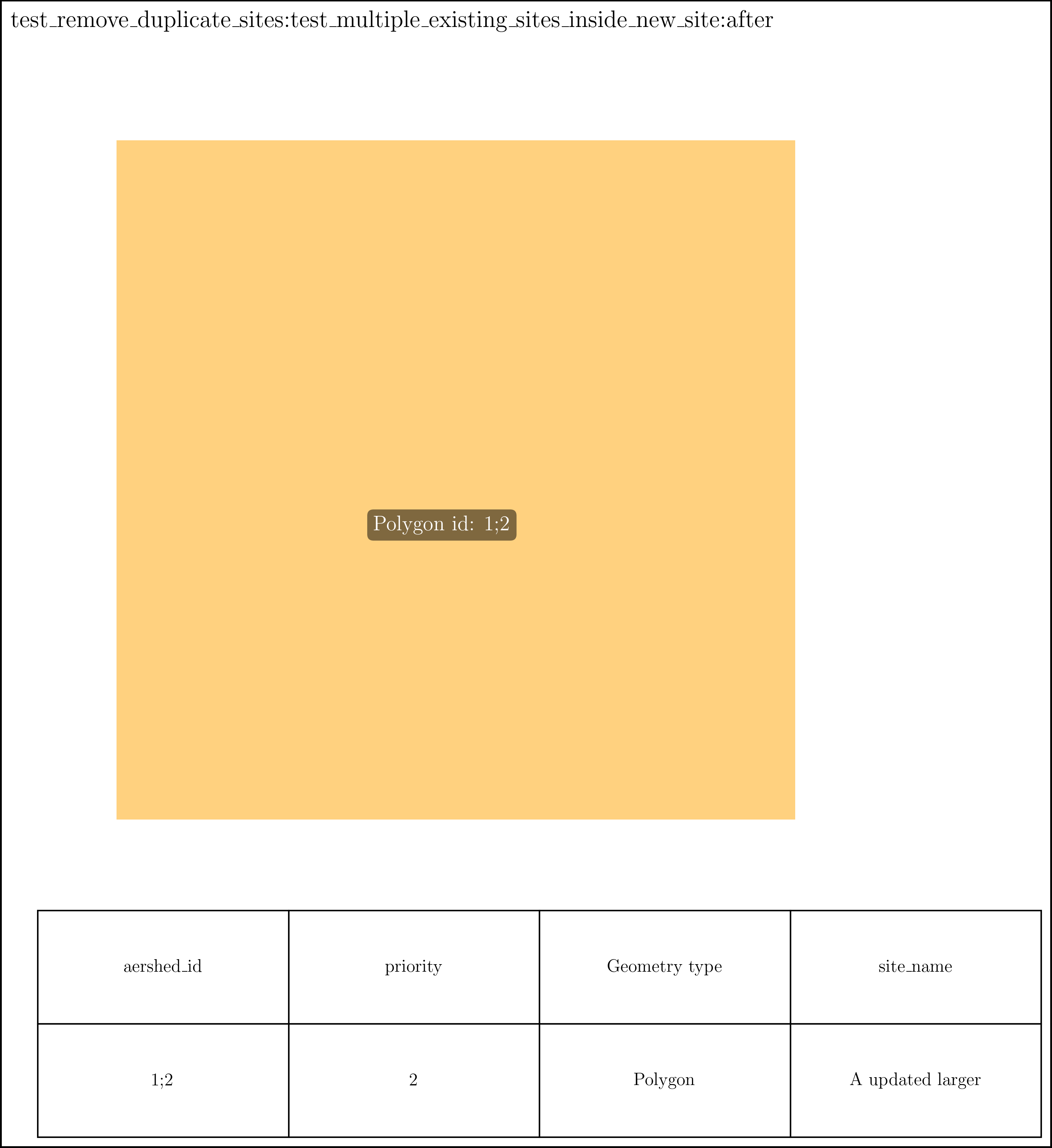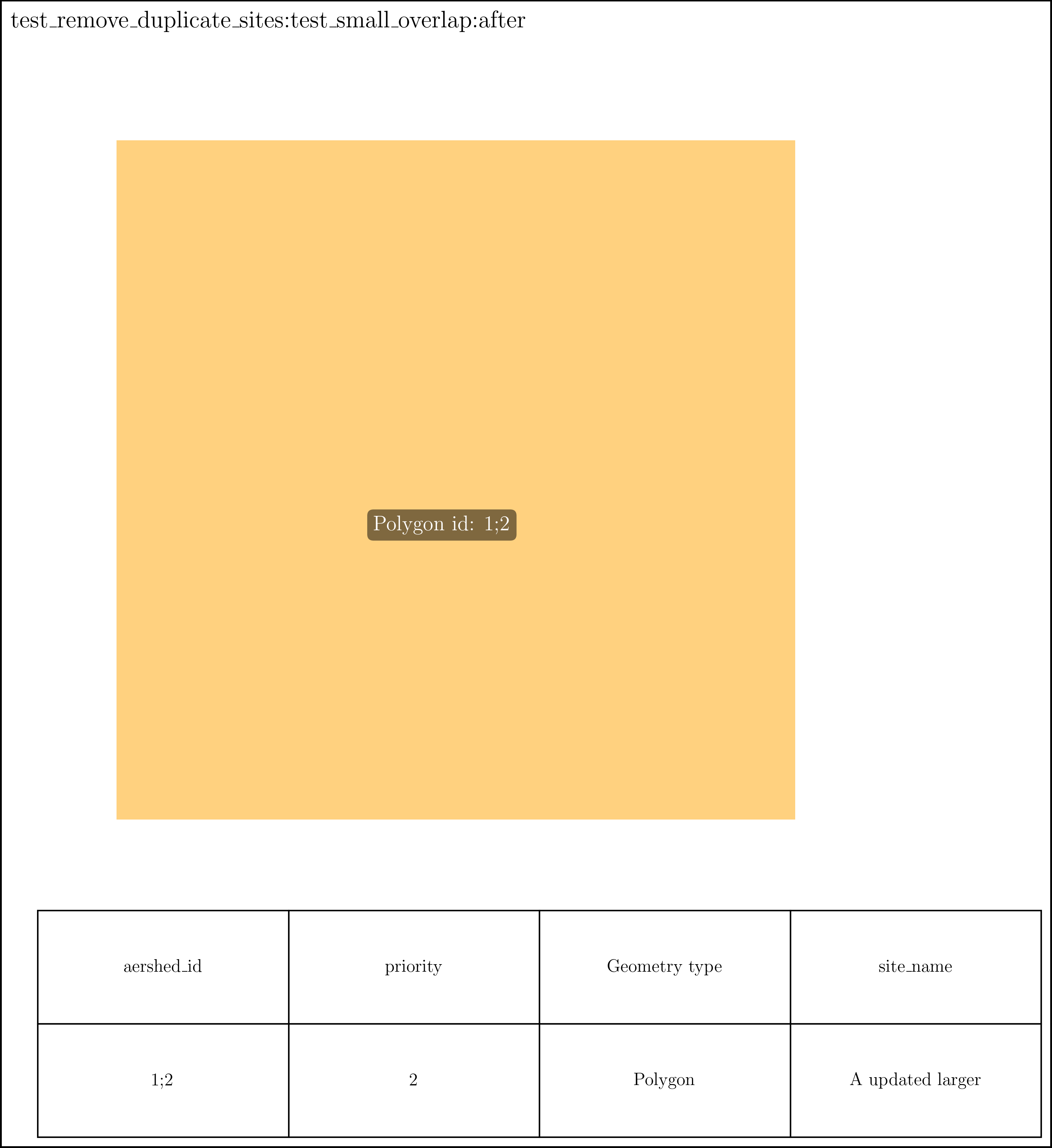 Combine two sites at the same location but with different polygons. The result should be a single site with the union of the two polygons and metadata from the higher priority site.