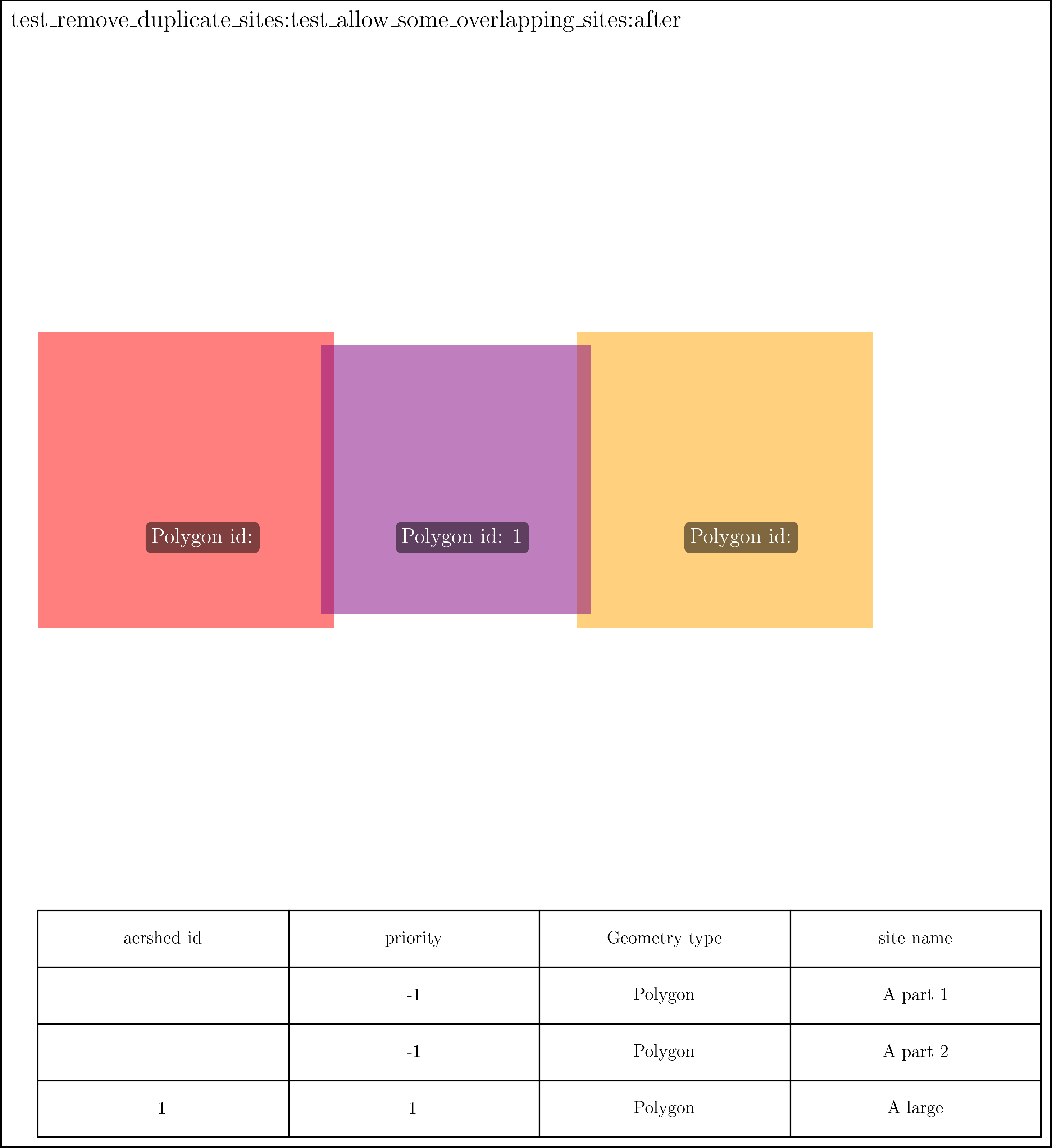 In this test we have two lower priority sites that overlap with a higher priority site. We want to allow some overlap so that the lower priority sites are kept. For this case we have set the overlap_threshold to 0.9 (90%).