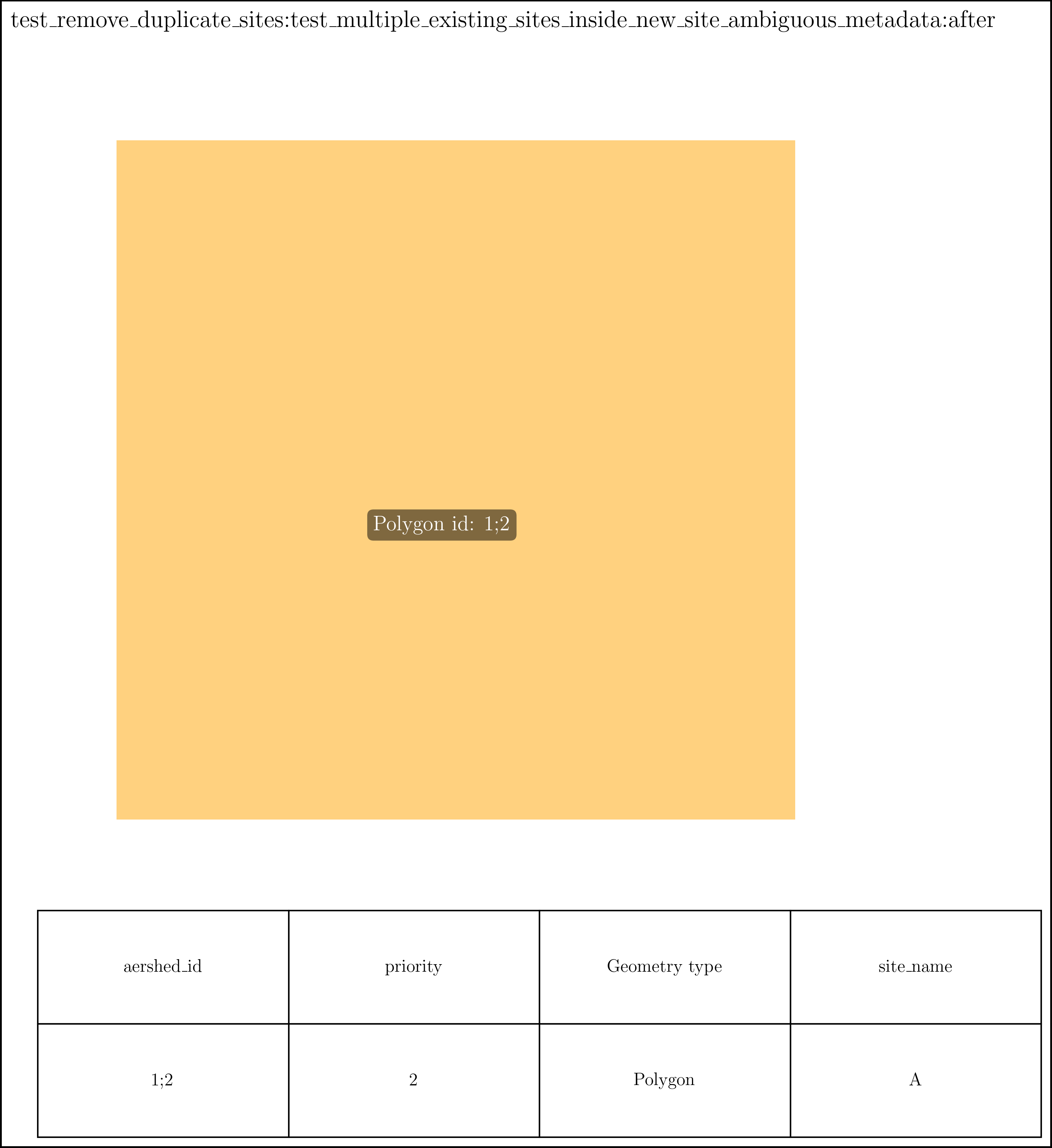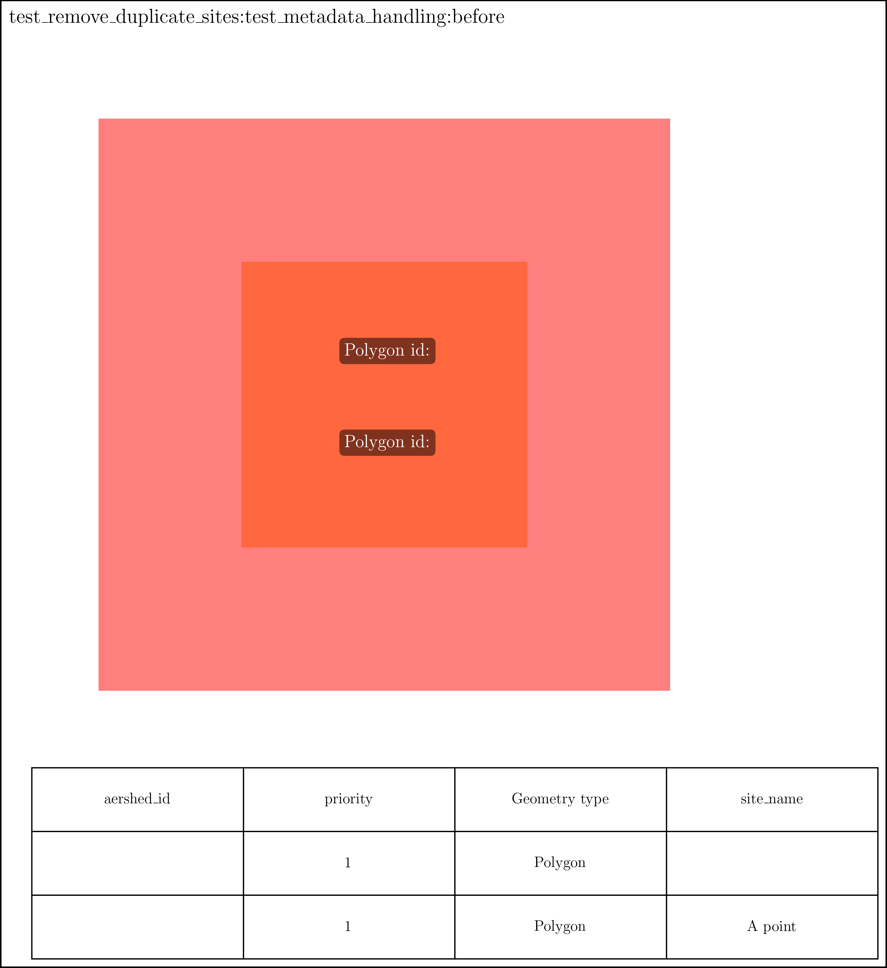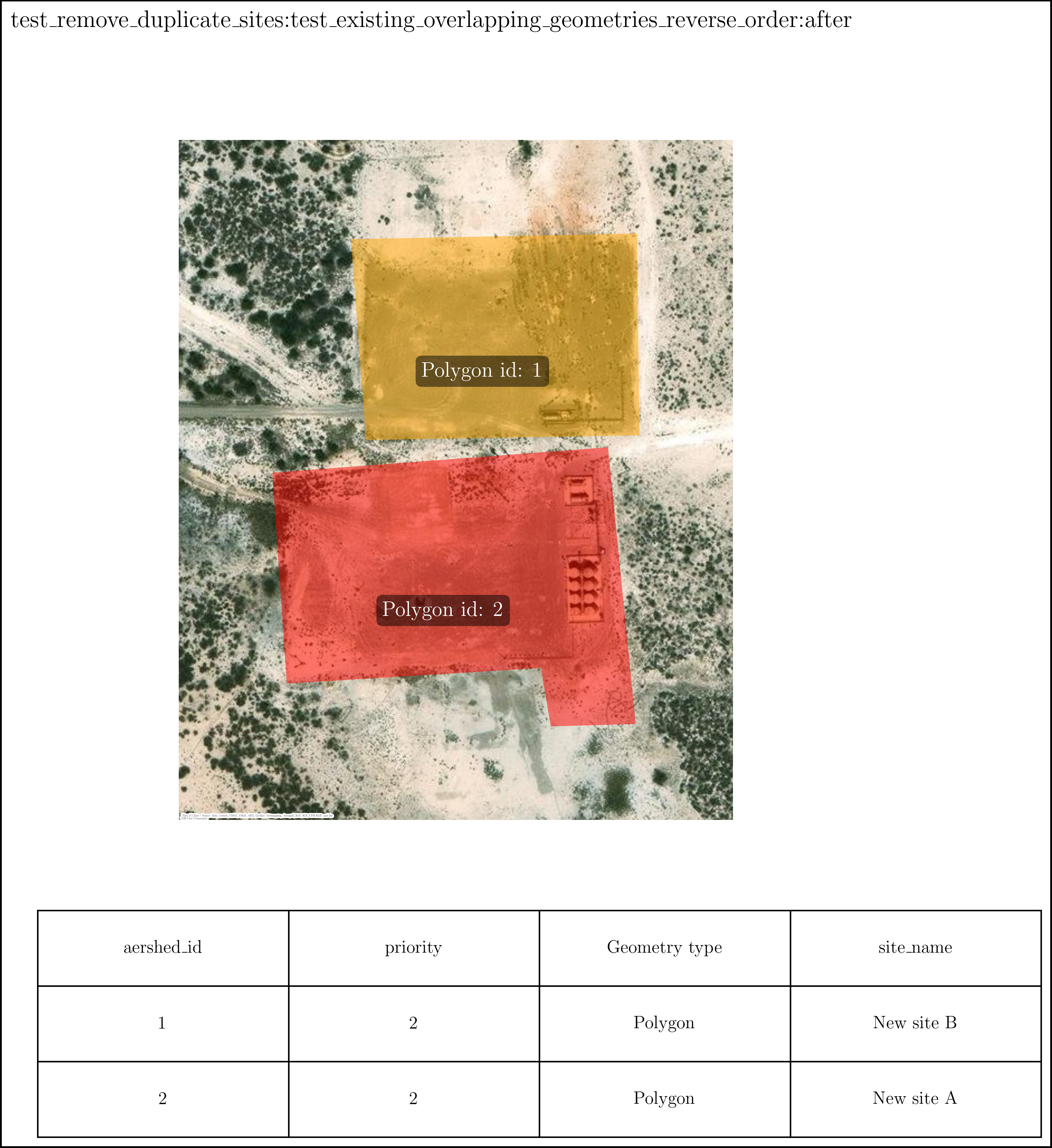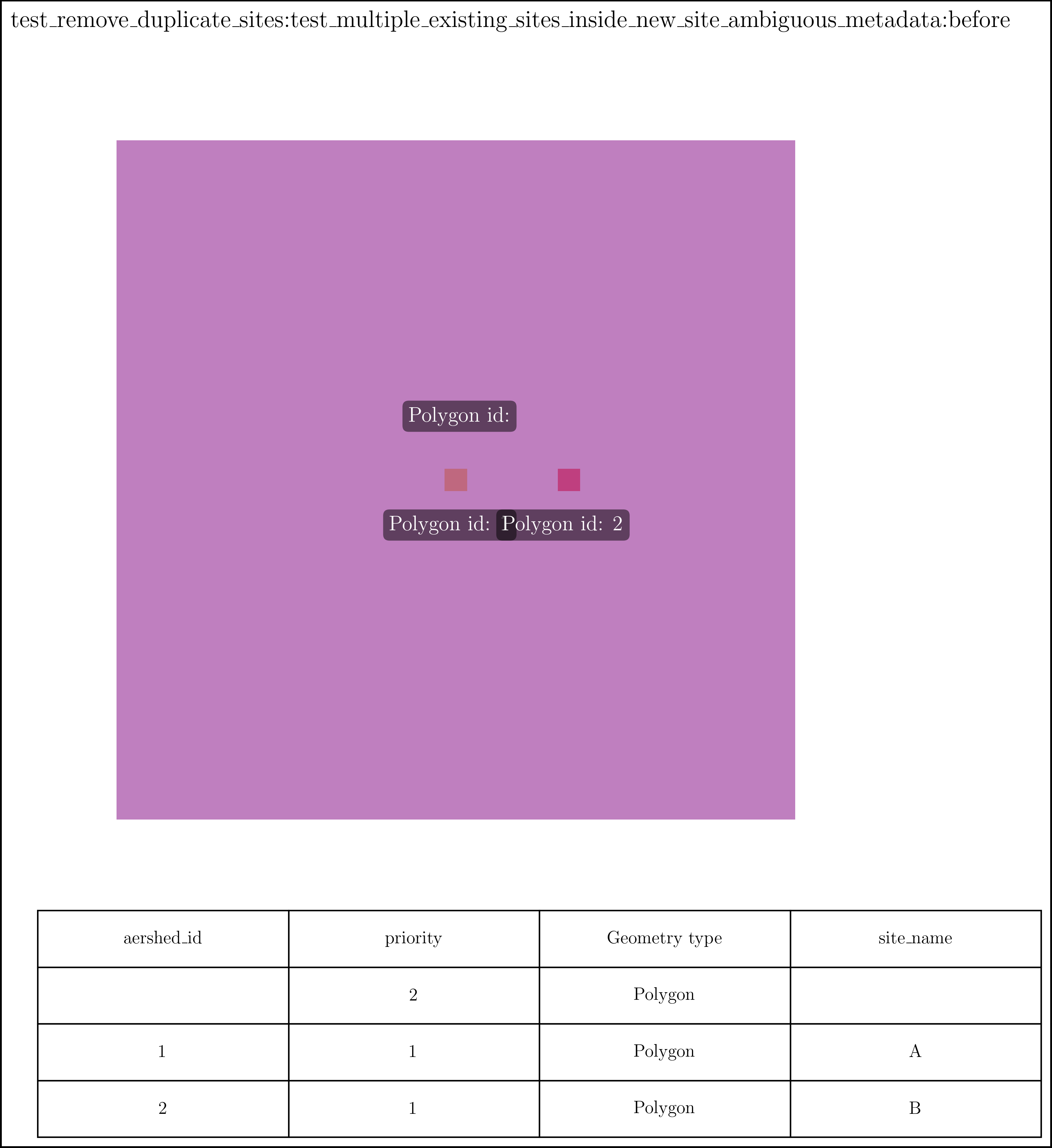 In this case we have two sites with the same geometry but different priorities. We should combine them into a single site. The metadata and site_name from the higher priority site should be chosen.